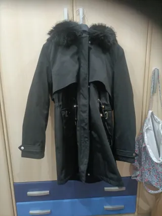 Chaquetón color negro, en perfecto estado, tiene dos bolsillos laterales con cremallera, por delante se abrocha con corchetes y cremallera, lleva una cinta con hebilla dorada en las mangas, tiene cinturón también con hebilla dorada (los dorados están un poco gastados). En la parte superior lleva capucha con una cinta para poder adaptarla a la cabeza y también tiene cuello de pelo artificial, los dos pueden desmontarse (capucha y cuello)