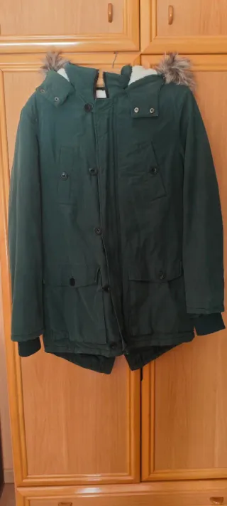 Chaquetón verde botella, de borreguito por dentro y pelo en la capucha. Talla M. Como nuevo.