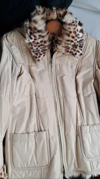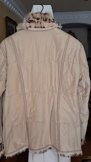Elegante chaquetón reversible con un lado de tejido gabardina color beis y otro de piel de pelo con diseño leopardo. - Cuello y puños con estampado animal. - Bolsillos delanteros en ambos lados. - Cierre reversible con cremallera. - Muy ponible y resistente. - Medidas: Largo total 73cm, Ancho cintura 52 cm.