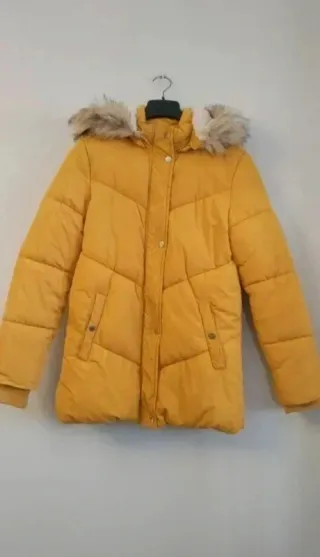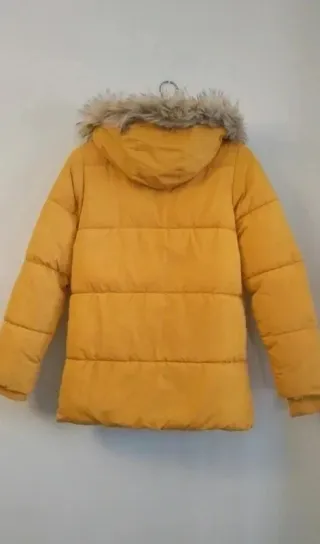 Chaquetón amarillo de mujer. Es súper abrigado y calentito. Pesa un poco debido al material con el que está hecho. Como se puede apreciar en las fotos, tiene pelo sintético y cuenta con cremallera y botones para cerrar. Además, tiene gorro, también forrado con pelito. Es muy cómodo y el color no es un problema para combinarlo con tus mejores prendas.