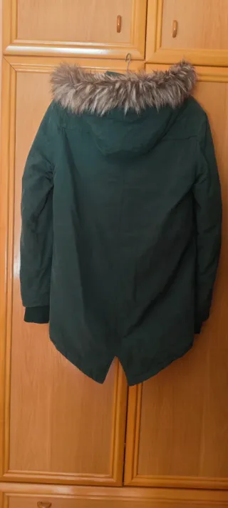Chaquetón verde botella, de borreguito por dentro y pelo en la capucha. Talla M. Como nuevo.