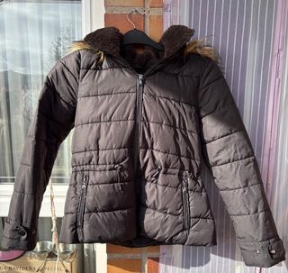 Chaquetón acolchado con capucha y detalles de pelo sintético. - Cierre de cremallera frontal. - Dos bolsillos laterales con cremallera. - Cintura ajustable con cordón. - Puños elásticos. Color negro acolchado e impermeable 45 CMS cintura (ajustable con cordón) 59 de larga, con forro desmontable y forrado. Bolsillos de cierre cremallera y detalle botones en mangas (46 CMS desde la sisa de larga y 61 desde el hombro) longitud hombros ( 41 CMS)