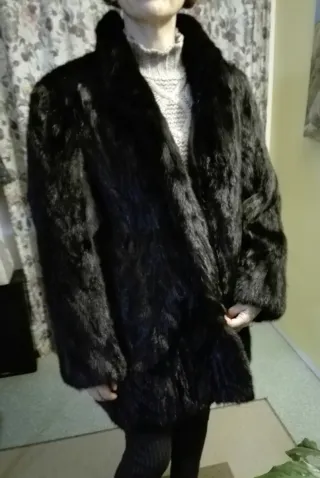 Elegante chaquetón de imitación visón. - Color marrón oscuro. - Tacto suave y sedoso. - Diseño clásico con cuello. - Ideal para ocasiones especiales o para añadir un toque de glamour a tu día a día.