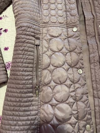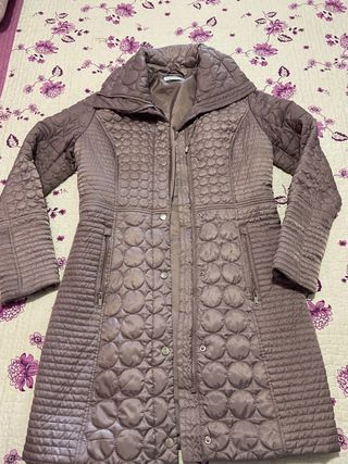 Chaquetón Geox, talla F 48 de mujer. Relleno de poliéster. Cierre con cremallera y corchetes. Cinturón de tela a juego. Tres bolsillos con cremallera, uno de ellos interior. El color es entre gris y verde oscuro. Medidas: 45 cm de hombro a hombro, 58 de axila a axila, 64 largo de la manga y 73 el largo del chaquetón. En la espalda abajo se le ha movido un poco el relleno y queda un poco levantado. Ver segunda foto