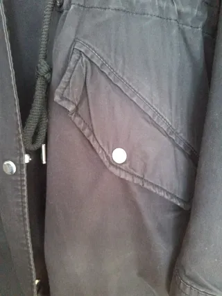 Chaquetón de Bershka con capucha y detalles modernos. - Diseño en color negro. - Talla M (equivalente a 38 o 10). - Capucha con pelo y forro borrego. - Forro borrego opcional.Son dos piezas independientes,se puede llevar más abrigado o de entretiempo sin forro.