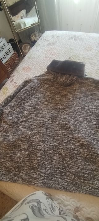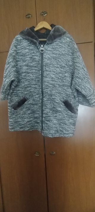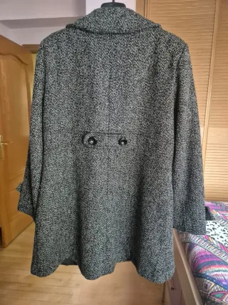 Chaquetón tipo capa, talla única, pero es para talla grande, 48-50. Es fino, no lleva forro. Con capucha. Manga 3/4. Poquísimo uso. Composición algodón y viscosa.
