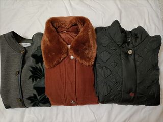 Lote: 1.- chaquetón color caldera, con cuello desmontable. Pone talla 46 en la etiqueta 2.- chaquetón color negro ( tiene un enganchón minúsculo en la manga izquierda por debajo)(foto 6). Pone talla 44 en la etiqueta. Ambos chaquetones son con cremallera y clicks para abrochar de arriba a abajo y cremalleras en los bolsillos. 3.- Chaqueta de punto gris oscuro con motivos en negro. Abrochada con botones. Es para una persona con talla 44 más o menos. Puedo facilitar más medidas si se solicitan. Precio lote: 17 euros. Se hacen envíos. Posibilidad de juntar más artículos de mi perfil. Preguntar.