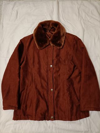 Chaquetón de mujer de color marron, exterior de algodón, capucha desmontable con cremallera, forrada de pelo, muy espectacular, así como parte del forro interior. Escelente estado. Lavable en casa.