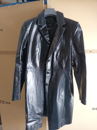 Elegante chaquetón de piel sintética con un diseño moderno. - Cuello tipo solapa. - Cierre de botones. - Cinturón a juego. - Bolsillos laterales. - Bolsillo interior. Se vende limpio de tintorería.