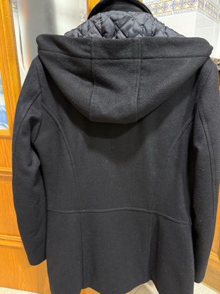 Chaquetón negro de mujer, de plumitas fino, de la marca Massimo Dutti. Talla S, es corto, por la cintura. También lleva una capucha que se puede poner o quitar con cremallera.