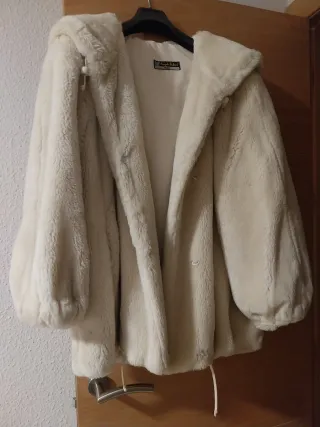 Elegante chaquetón de pelo sintético con capucha. Se ha usado en un par de ocasiones. - Tacto muy suave. - Cierre con botón. - Puños y bajo con acabado en pelo.