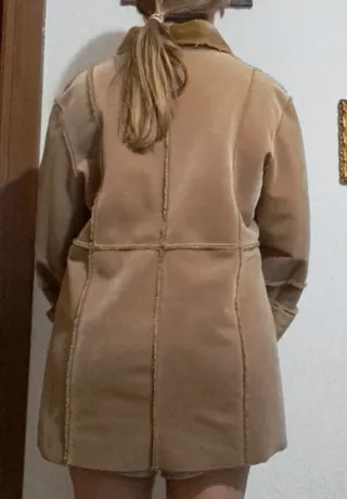 Elegante chaquetón de mujer con un diseño moderno. NO ME QUEDA MUY BIEN PORQUE ES UNA TALLA GRANDE PARA MI. -todo el interior de pelo de terciopelo. - Color beige y marrón. - Acabado suave y cálido. - Detalle de pelo en puños y cuello.