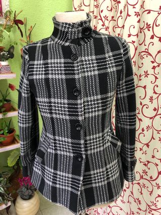 Chaquetón con un diseño elegante y moderno, perfecto para añadir un toque sofisticado a tu vestuario. - Patrón de cuadros clásico en blanco y negro. - Cuello alto con cierre de botones. - Corte entallado que realza la figura. - Bolsillos frontales con solapa. - Perfecto estado. Talla 40.