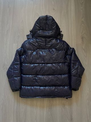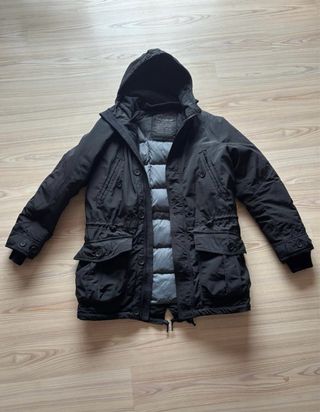 Chaquetón de plumas, reversible color negro por una cara y azul y gris por la otra. - Diseño acolchado. - Cintura ajustable con cordón. - Cierre de cremallera. - Como nuevo.
