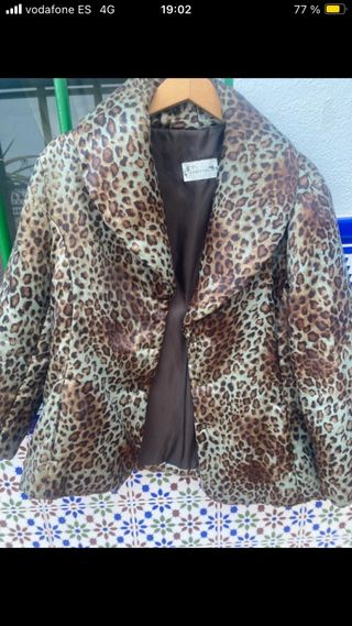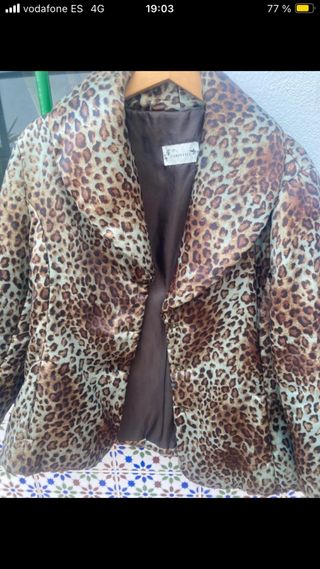 Elegante chaquetón corto con un llamativo estampado de leopardo. Su diseño moderno lo hace perfecto para añadir un toque de estilo a cualquier atuendo. - Diseño corto. - Estampado de leopardo. - Forro interior.