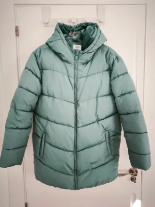 Chaquetón acolchado de color verde con capucha. - Cierre de cremallera frontal. - Diseño acolchado con costuras. - Capucha integrada. - Talla M real.