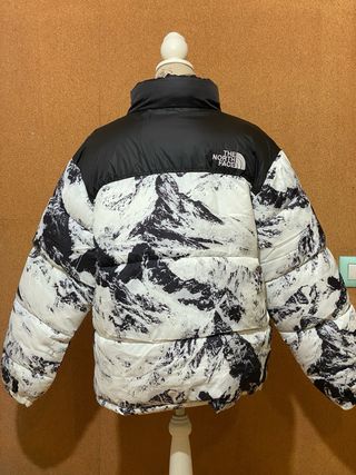 Chaquetón The North Face con un llamativo estampado de montañas en blanco y negro. Es una prenda cálida y con estilo. - Diseño de cuello alto. - Cierre frontal con cremallera. - Bolsillos laterales con cremallera. Escucho ofertas