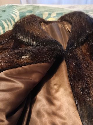 zorro australiano ,tonos marrones y beis,recto largo por la ingle cuello smokin, una manga parte interior algo desgastada ,talla42 , contorno pecho 100 C muy buen estado