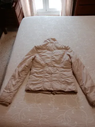Chaquetón para mujer en tono beige. Una prenda versátil y con estilo. No pesa nada. Se puede lavar en la lavadora. En buen estado. Muy juvenil. - Cuello alto con textura. - Cierre de cremallera y botones. - Bolsillos frontales con cremallera. - Mangas largas con puños.