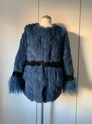 Elegante chaquetón de piel con un diseño único. - Combinación de colores azul y negro. - Acabado de pelo largo y rizado.