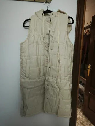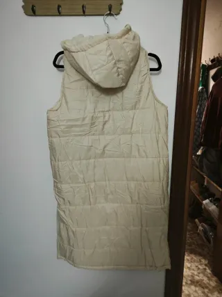 Chaquetón largo sin mangas en color beige. Es una prenda versátil y cómoda. - Cierre de cremallera y botones a presión. - Capucha. - Cordones ajustables en la capucha. - Bolsillos laterales.