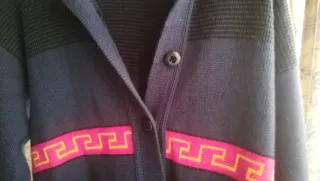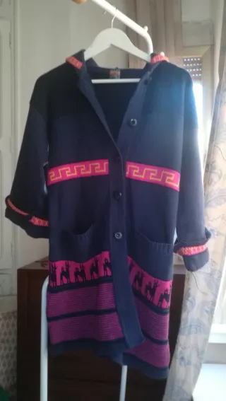 Chaquetón de lana con un diseño llamativo y original, con capucha y manga 3/4. - Tejido de lana en color azul. - Adornado con cintas de greca en color fucsia y amarillo. - Estampado de figuras de llamas en la parte inferior. - Dos bolsillos frontales.