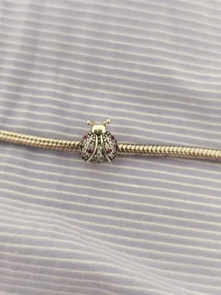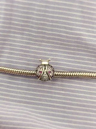 Este encantador charm tiene forma de mariquita, adornado con circonitas que le dan un toque brillante. Le falta una circonita pero no se nota nada. Lo dejo a 8€ por eso. - Fabricado en plata de ley. - Detalles en circonitas rosas y blancas.