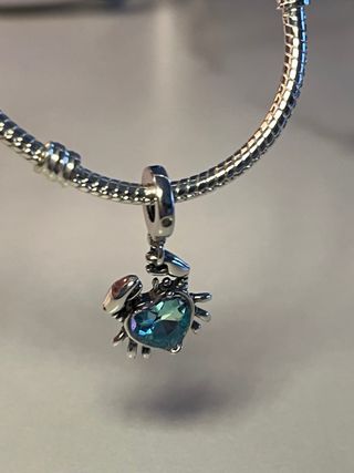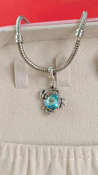 Este encantador charm tiene forma de cangrejo con un corazón azul en el centro. Es un accesorio llamativo para tu pulsera Pandora. Acabado Plata 925. Nuevo. - Diseño detallado de cangrejo. - Corazón Circonita azul