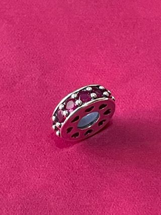 Charm en plata S925 con un diseño ovalado y una piedra de color rojo-rosa intenso, montado en una base plateada. Ideal para tú pulsera Pandora. - Piedra central de cristal facetado. - Se entrega con bolsita en sobre acolchado.