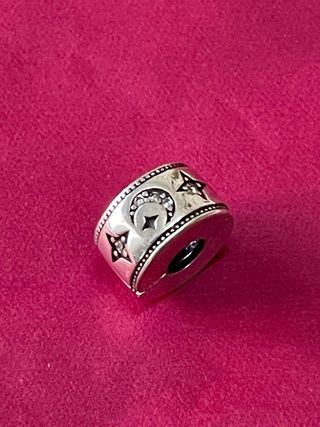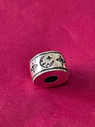 Charm de plata con diseño de lunas y estrellas. - Detalles de pequeñas bolitas. - Motivos celestes. - Apto para pulseras.