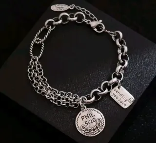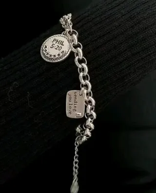 Pulsera de plata con varios charms decorativos. - Diseño de eslabones variados. - Charm redondo con inscripción PHIL 5:20. - Charm rectangular con mensaje sending you love y un dibujo. - Cierre de mosquetón.