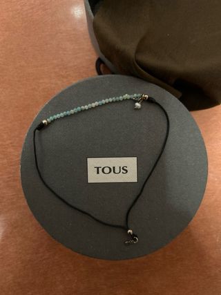 Elegante pulsera de la marca Tous, con un diseño delicado y ajustable. - Elaborada con hilo negro. - Detalle de pequeñas piedras en tonos celestes. - Cierre con charm de plata.