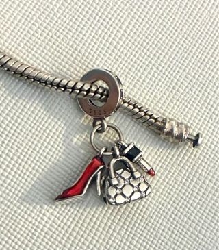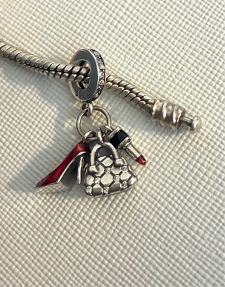 Este charm de plata de ley es un accesorio encantador para tu pulsera. - Diseño detallado de zapato de tacón rojo. - Bolso plateado con incrustaciones. - Labial con detalles en rojo y negro.