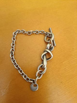 Elegante pulsera de plata con un diseño único. - Cierre de tipo toggle. - Charm con forma de nudo. - Pequeño medallón con logo.