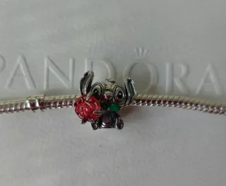 Encantador charm de Stitch sosteniendo una rosa roja. - Fabricado en plata S925. - Detalle de esmalte en la rosa y el collar de Stitch. Película Lili y Stich Disney. Compatibles con pulseras de abalorios charms dijes de pandora y similares.