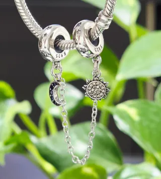 Este charm de plata S925 es un accesorio encantador para tu pulsera. Seguro Cadena para evitar la perdida de tus Charm a la hora de retirar tu pulsera. - Diseño de sol y luna. - Cadena de seguridad. - Detalles en piedras oscuras en la luna. - Acabado brillante.