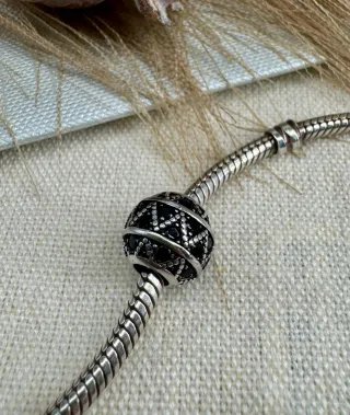 Charm con diseño intrincado y detalles en relieve. Ideal para personalizar pulseras o collares. - Diseño esférico con patrón geométrico. - Acabado plateado con incrustaciones negras.