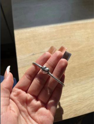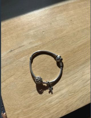 Elegante pulsera de la marca Pandora, elaborada en plata. - Diseño de cadena tipo serpiente. - Cierre de corazón. - Cuenta con un charm de esfera con diseño intrincado. - Adicionalmente, tiene un charm en forma de cruz. La vendo porque no me la pongo, tiene tiempo pero la he limpiado con un producto especial para limpiar plata y se ha quedado como nueva ESCUCHO OFERTAS