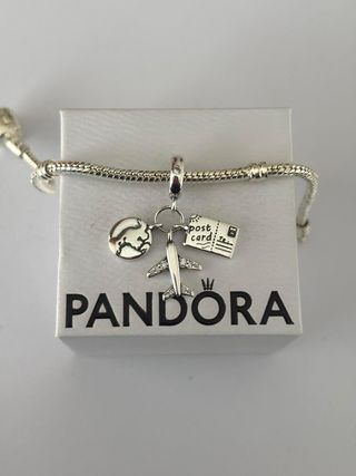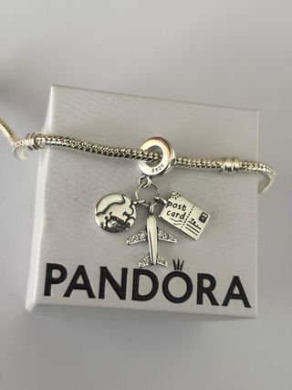 Charm modelo de viajes. - Fabricado en plata de ley S925. - Diseño con avión, globo terráqueo y postal. - Detalles en circonitas. - Marca: Son modelos compatibles, NO son de la marca Pandora oficial. - Presentación: Se entregan en una bolsita protectora individual bien embalados. NO incluyen caja ni estuche.