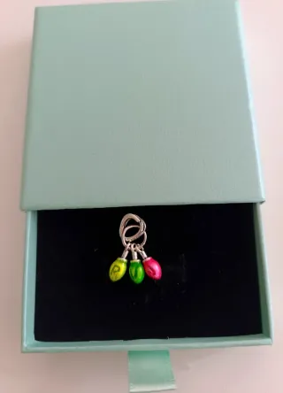 Charm inspirado en Stranger Things, con un diseño de bombillas de Navidad. - Tres charms colgantes: uno amarillo con la letra 'R', uno verde con la letra 'U' y uno rosa con la letra 'N'. - Cierre de aro plata. - Brilla en la oscuridad. - Incluye caja de regalo. - precio sin cajita de regalo 12€.