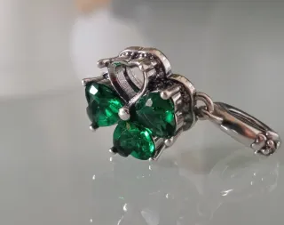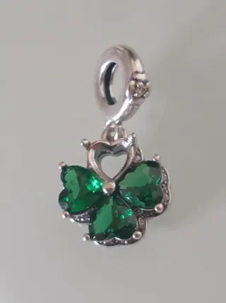 Vendo elegante charm de plata en forma de trébol de cuatro hojas y cristales verdes brillantes. Su diseño giratorio aporta un efecto dinámico y simboliza buena suerte y energía positiva. Ideal para pulseras o collares, perfecto como regalo o para complementar tu estilo diario. - Diseño de trébol de la suerte. - Elaborado en plata. - Engastado con piedras verdes. - Sello S925.