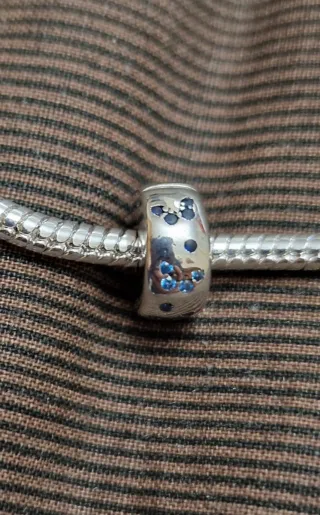 Este charm es un accesorio elegante para tu pulsera. - Diseño con incrustaciones de pequeñas piedras azules. - Acabado metálico plateado.