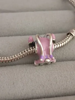 Este charm es un adorable perrito con un bolso,lucky. - Diseño de perrito hecho de esmalte rosa. - Detalles de circonitas blancas. - Incluye un pequeño bolso negro. - Colgante con forma de corazón morado. - Cierre plata con grabado S925.