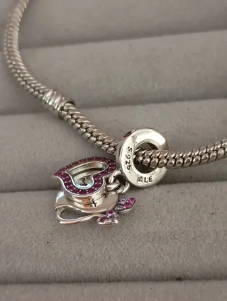 Precioso charm en forma de corazón adornado con circonitas brillantes para la pulsera tipo pandora. Sin marca. Diseño de corazón con siluetas de Minnie y Mickey con incrustaciones de circonitas. Plata S925 Parece oscurecido en las fotos. Esto se debe a la sombra.
