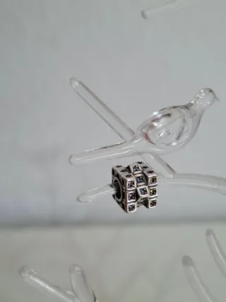 Charm con diseño de cubo Rubik, adornado con pequeñas gemas de colores. Plata S925. - Diseño tridimensional. - Detalles en tonos morado, azul y amarillo.