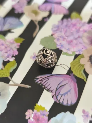 Charm de plata 925 con diseño de esfera, adornado con una rosa y una libélula. - Material: Plata 925. - Diseño: Esfera con detalles de rosa y libélula. - Acabado: Plateado.