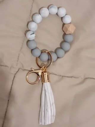 Este set incluye dos llaveros/pulseras versátiles que también pueden usarse como charms para bolsos. Son un accesorio práctico y a la moda. SIN ESTRENAR - Diseño de cuentas de silicona. (Gris, amarillo y blanco amarmolado). - Detalle de borla colgante. - Incluye un charm de madera hexagonal. También se venden por separado a 2€ la unidad.
