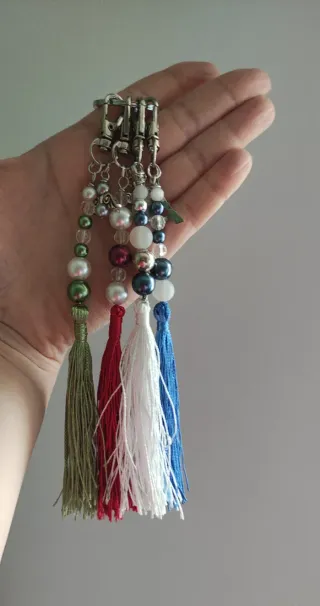 Llavero artesanal hecho a mano,este accesorio combina elegancia y estilo boho,ideal para darle un toque especial a tus llaves o como charm decorativo para tu bolso favorito. Diseño exclusivo,perfecto si buscas algo diferente y artesanal. Es el detalle perfecto como regalo de cumpleaños,amigo invisible o simplemente para darte un capricho. - Borla roja con abalorios blancos y burdeos. Charm de mariposa. - Borla verde con abalorios blancos y verdes. Charm de angelito. - Borla azul con abalorios blancos y azules. Charm de torre Eiffel. - Borla blanca con abalorios nacarados y plateados. Charm de plumas. - Cierres de mosquetón plateado