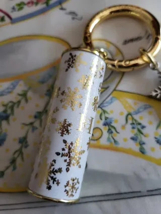 Este llavero tiene un diseño invernal con un charm de copo de nieve. Se puede llegar a un acuerdo en el precio. - Carcasa con estampado de copos de nieve. - Anilla dorada. - Charm de copo de nieve plateado y dorado. -Iman con flecos morado -Labial rojo,carolina herrera con estrella estampada en la barra. -Todo con su caja original de carolina herrera