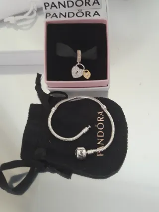 Conjunto original salvo por el de pedrería ese no es de Pandora los demás incluida pulsera y cadena de seguridad son oficiales. - Pulsera barril 17 centímetros - Cadena de seguridad - Charm con diseño de flor - Charm ovillo - Charm de corazón - Colgante de corazón con circonitas